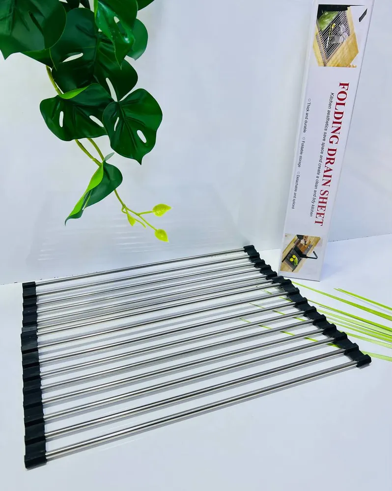 Ce produit est un égouttoir d'évier roulant révolutionnaire, conçu pour optimiser l'espace dans la cuisine. Il se compose de tiges en acier inoxydable de qualité alimentaire soudées et revêtements de silicone noir antidérapant aux extrémités. Sa conception lui permet d'être déroulé directement au-dessus de l'évier , créant une surface de travail ou d'égouttage supplémentaire. Il est vendu dans un emballage portant l'inscription "FOLDING DRAIN SHEET" (Tapis d'évacuation Pliable).
