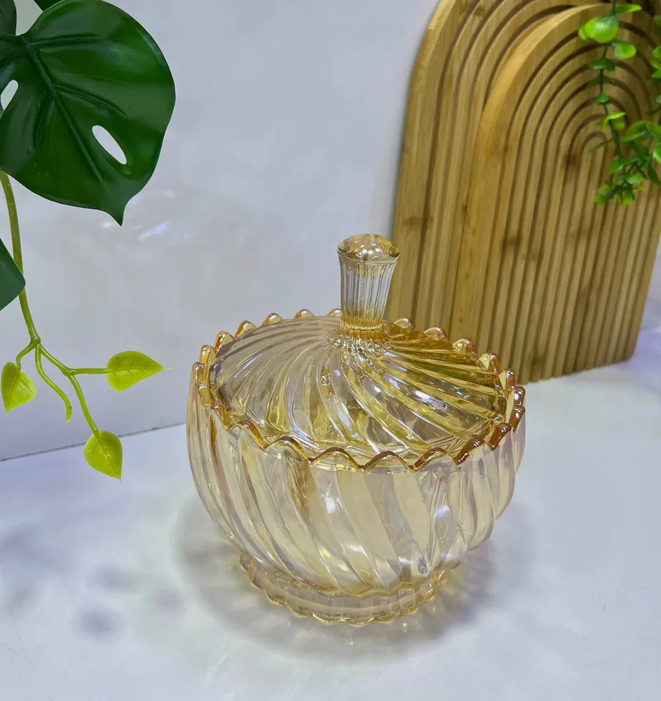 0.0 | Bonbonnière Décorative Torsadée Ambrée | 40.00 | Il s'agit d'une élégante bonbonnière ou d'un pot de service décoratif fabriqué en verre teinté d'une belle couleur ambrée (jaune-doré). Le corps et le couvercle de la pièce sont ornés de motifs torsadés ou spiralés qui captent magnifiquement la lumière, ajoutant texture et éclat. Le couvercle est surmonté d'une poignée ciselée pour une manipulation facile. Reposant sur une base décorée d'un motif festonné, ce pot allie une fonctionnalité de rangement à une forte valeur décorative, s'intégrant parfaitement dans un décor moderne ou classique. Caractéristiques :