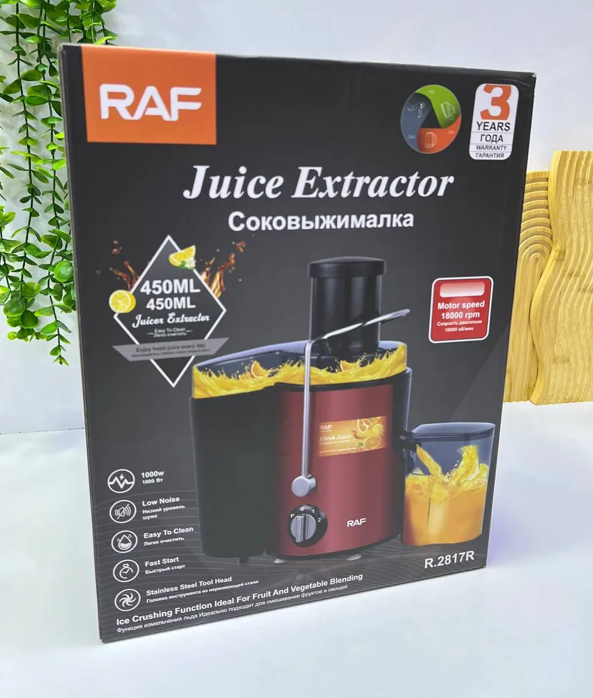 0.0 | Centrifugeuse Électrique Puissante RAF R.2817R | 250.00 | Cette centrifugeuse est conçue pour extraire rapidement et efficacement le jus de fruits et légumes. C'est un appareil moderne qui allie puissance et facilité d'utilisation. Son corps, de couleur rouge et noir, lui donne une allure élégante. Elle est équipée d'une tête d'outil en acier inoxydable robuste pour un pressage optimal et d'un moteur puissant de 1000 W. L'une de ses principales caractéristiques est son fonctionnement à faible niveau sonore (Low Noise), garantissant une expérience plus agréable. Elle est également pensée pour un nettoyage facile (Easy to Clean) et un démarrage rapide (Fast Start). Le produit est livré avec un grand récipient pour recueillir le jus frais. Caractéristiques Clés :