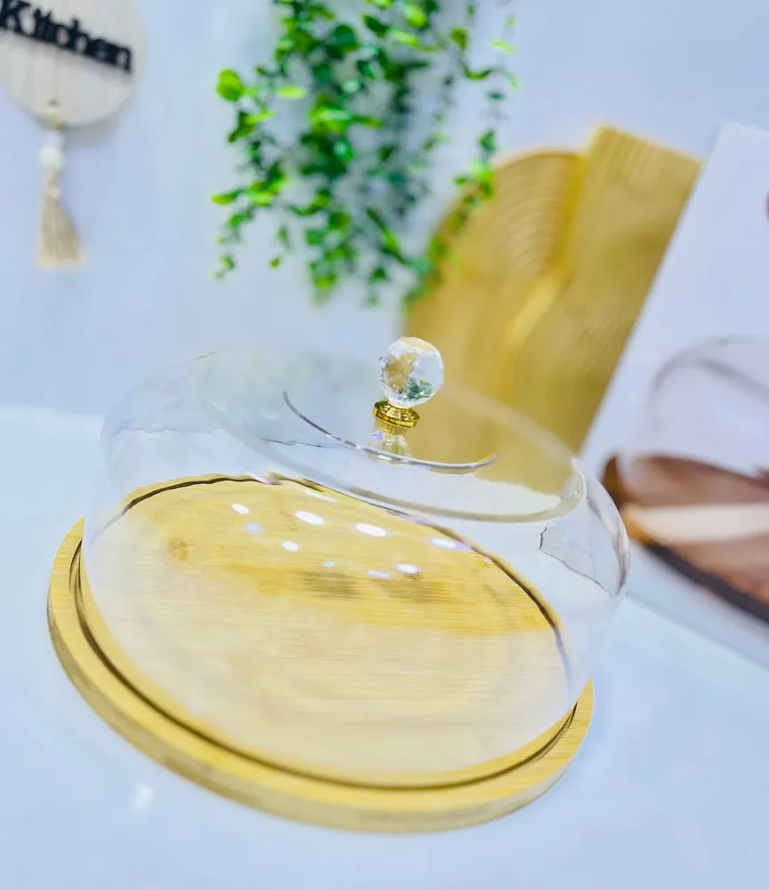 0.0 | Coffret de Luxe Deluxe Cake Box avec Cloche en Verre et Plateau en Bois | 95.00 | Ce coffret de présentation "Deluxe Cake Box" est l'écrin idéal pour mettre en valeur et conserver vos pâtisseries. Il se compose d'un grand plateau de service en bois d'Acacia (ou bois similaire) avec des teintes naturelles et contrastées, et d'une cloche de protection en verre ou acrylique de haute qualité. La cloche est surmontée d'une poignée décorative en cristal ou en verre taillé avec une base dorée, facilitant la manipulation tout en ajoutant une touche d'élégance. Cet ensemble est conçu pour allier l'esthétique "Just For Quality life" à la fonctionnalité.