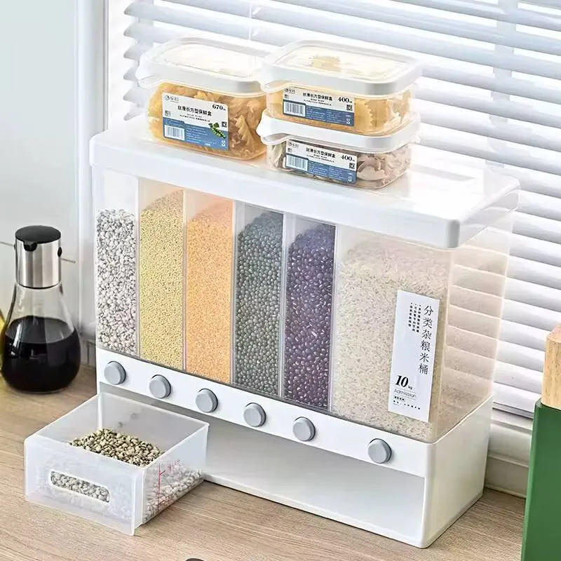 Cet organisateur de cuisine ingénieux est conçu pour stocker et distribuer vos céréales et grains secs de manière hygiénique et précise. Le distributeur se compose d'un corps principal blanc avec six compartiments transparents séparés, permettant de ranger différents types d'aliments (riz, lentilles, haricots, maïs, etc.) sans qu'ils ne se mélangent. Chaque compartiment est équipé d'un bouton poussoir pour un contrôle facile de la quantité distribuée, qui tombe directement dans le tiroir inférieur, souvent gradué. Sa conception modulaire permet de le placer sur un comptoir ou de le fixer au mur, optimisant ainsi l'espace de rangement.