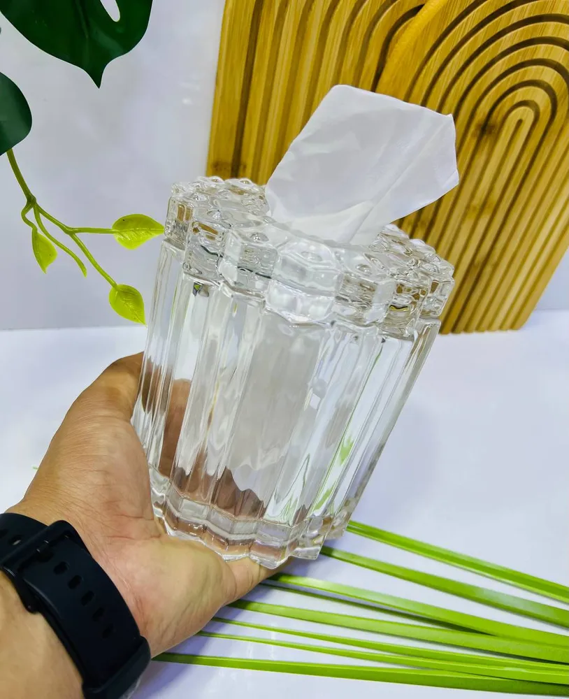 Ce distributeur de mouchoirs allie l'utilité quotidienne à un design d'une élégance cristalline. Fabriqué à partir de verre transparent de haute qualité, sa forme cylindrique est rehaussée par un motif de cannelures verticales et un sommet facetté, créant un jeu de lumière éblouissant. Il est conçu pour contenir et distribuer proprement les mouchoirs, ajoutant une touche sophistiquée à n'importe quelle pièce, qu'il s'agisse du salon, de la salle de bain ou du bureau.