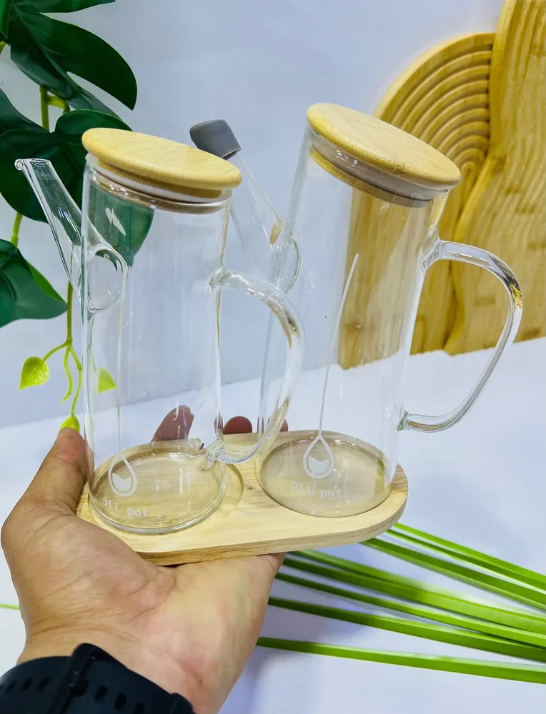 Matériau : Verre résistant (probablement borosilicate), Bambou naturel, Silicone (pour le bouchon/bec). Composition (3 pièces) : Deux (2) bouteilles verseuses (Oil Pot) et un (1) plateau de présentation en bambou. Design : Poignée latérale pour une prise en main facile et bec verseur conçu pour verser sans égouttement. Inscription : Marquage "Oil Pot" sur le fond des bouteilles. Esthétique : Look épuré et fonctionnel. |