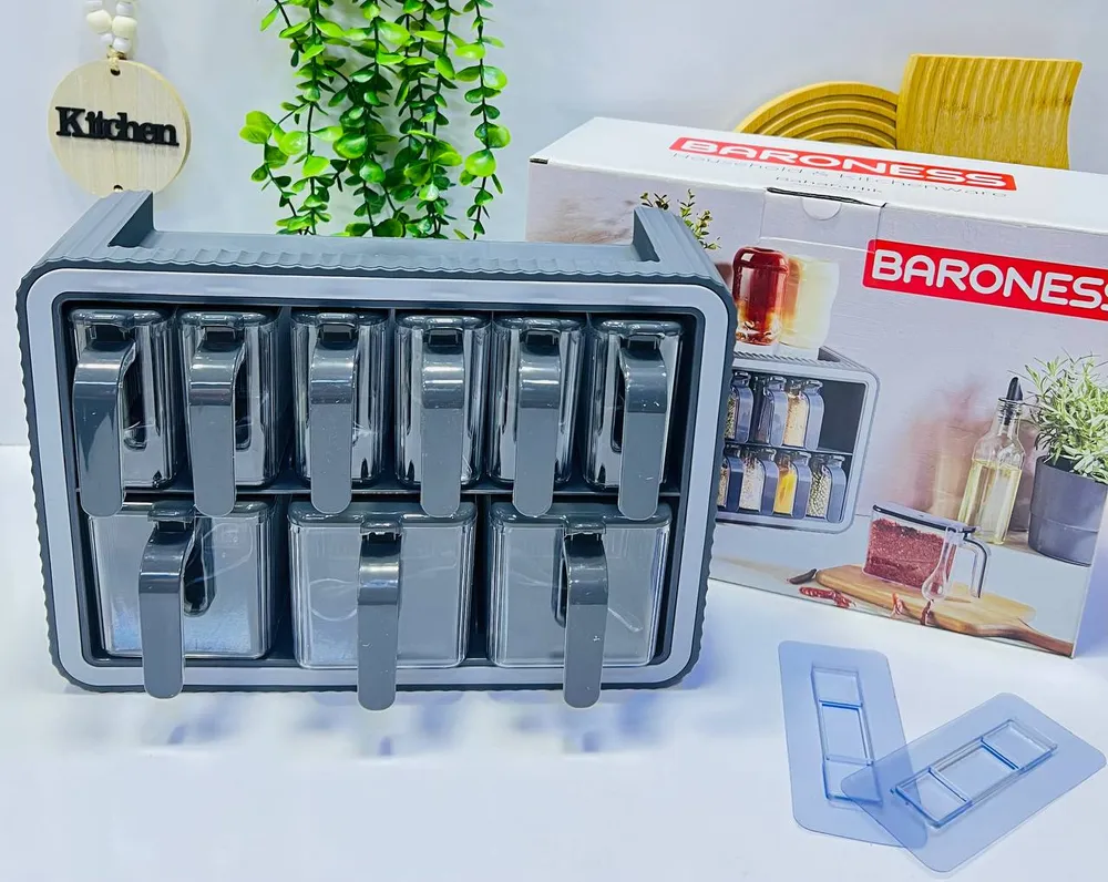 Cet organisateur de cuisine modulaire et élégant est la solution parfaite pour garder vos épices, sel, sucre et condiments essentiels bien rangés et accessibles. L'ensemble est composé d'un cadre de rangement principal (souvent mural ou de comptoir) pouvant accueillir six pots transparents, auxquels s'ajoutent deux pots externes plus grands, pour un total de huit unités. Chaque pot est conçu avec une poignée ergonomique et un couvercle hermétique pour préserver la fraîcheur, et est livré avec une petite cuillère pour le dosage. Le design gris fumé et cannelé moderne ajoute une touche de sophistication à n'importe quel comptoir de cuisine.
