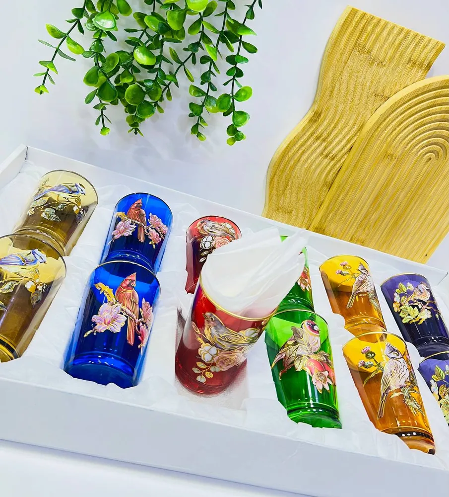 Le matériau principal est le verre coloré et épais. L'ensemble est composé de 12 verres (chacun avec une couleur et un motif différents ou assortis par paire). Le décor est émaillé et résistant, représentant des oiseaux majestueux et des motifs floraux. Les couleurs sont vibrantes et la base est stable. La présentation dans un coffret en fait un cadeau parfait.