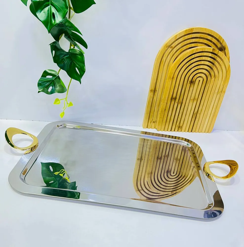 Ce plateau de service rectangulaire luxueux est conçu en acier inoxydable de haute qualité pour une brillance durable. Il présente une finition principale argentée effet miroir, contrastée par deux élégantes poignées découpées de couleur dorée avec un motif de bois/marbre. C'est un accessoire indispensable pour les réceptions formelles ou pour ajouter une touche glamour à votre décoration.