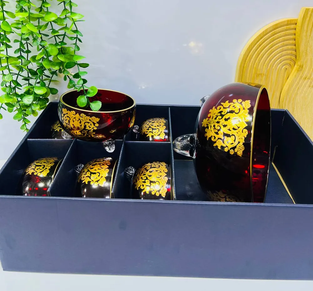 0.0 | Service de Bols en Verre de Luxe 'Mosaïque Orientale' (7 Pièces) | 290.00 | Cet ensemble éblouissant de sept bols de service est une véritable œuvre d'art de table. Il comprend un grand bol central de couleur rouge rubis éclatante, entouré de six petits bols aux teintes vibrantes : bleu saphir, vert émeraude, violet améthyste, ambre, rouge foncé, et un ton fumé doré. Chaque bol est magnifiquement décoré de motifs dorés complexes d'inspiration orientale ou baroque et repose sur de petits pieds transparents qui rehaussent leur présentation. C'est le service parfait pour ajouter une touche luxueuse et festive à tout repas ou événement spécial. Caractéristiques :