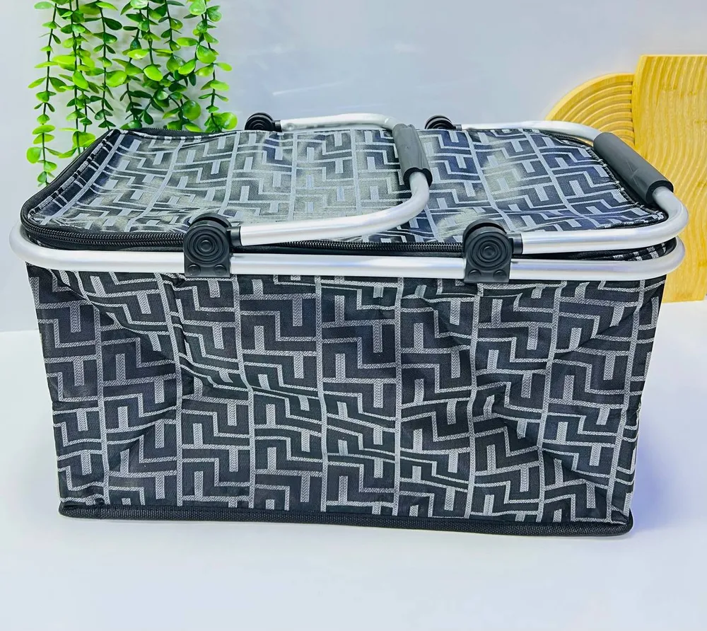 Ce panier isotherme est un accessoire indispensable pour les pique-niques, les courses et les sorties. Il combine une grande praticité avec un design moderne et élégant. Sa structure est composée d'un tissu extérieur robuste à motif géométrique noir et gris et d'une doublure intérieure isolante qui maintient les aliments et boissons au frais ou au chaud pendant plusieurs heures. Les anses en aluminium sont légères mais très solides, équipées de poignées ergonomiques pour un transport confortable. Une des caractéristiques principales est sa capacité à se plier à plat pour un rangement facile et peu encombrant. Le couvercle à fermeture éclair assure une isolation maximale.