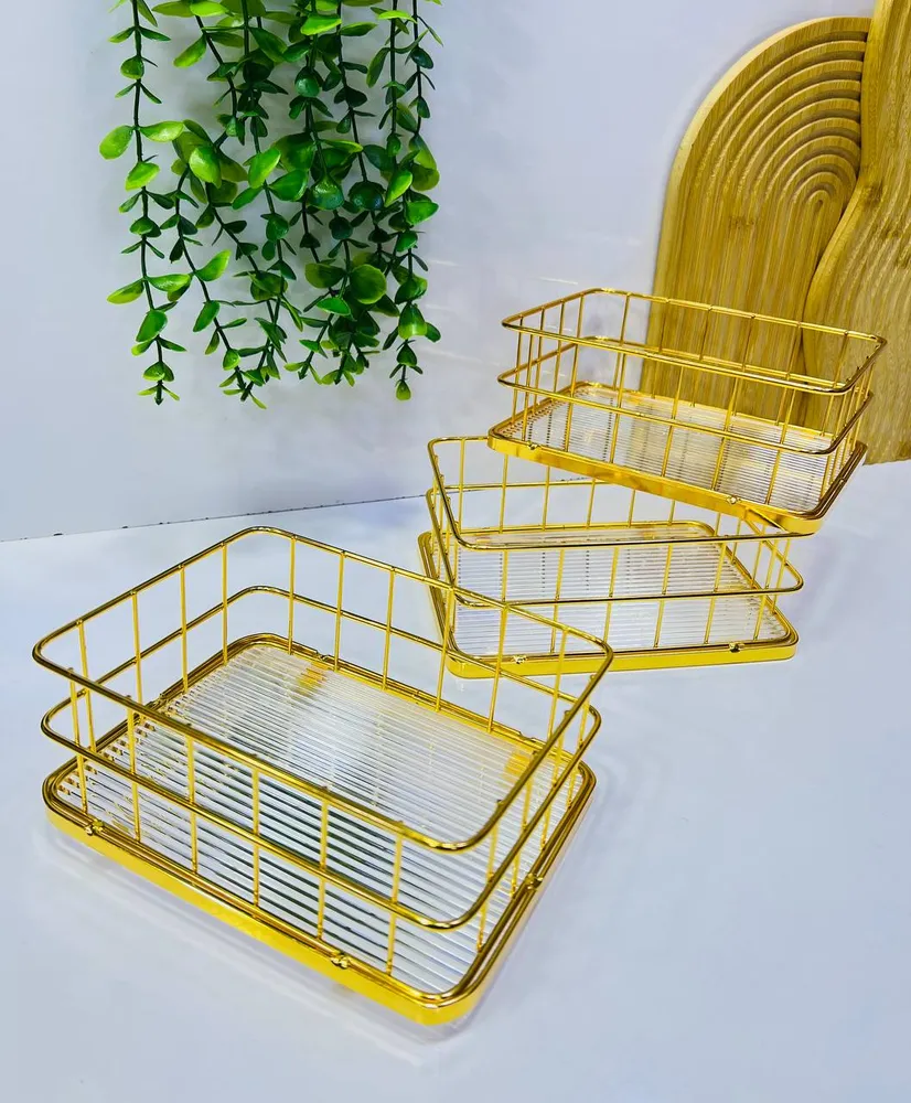 0.0 | Panier de Rangement Grille Dorée Luxe | 20.00 | Ce panier de rangement rectangulaire, nommé "Grille Dorée Luxe," est un organisateur chic et polyvalent conçu pour ajouter une touche de glamour à votre intérieur tout en maintenant l'ordre. Il se distingue par sa combinaison de matériaux : une structure en fil de métal doré brillant formant un panier aéré, posée sur une base solide en acrylique transparent (ou verre) avec des stries décoratives. Ce design élégant le rend idéal pour organiser et présenter de petits articles avec style, sans cacher complètement leur contenu. Caractéristiques et Utilisations :
