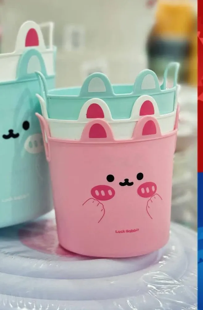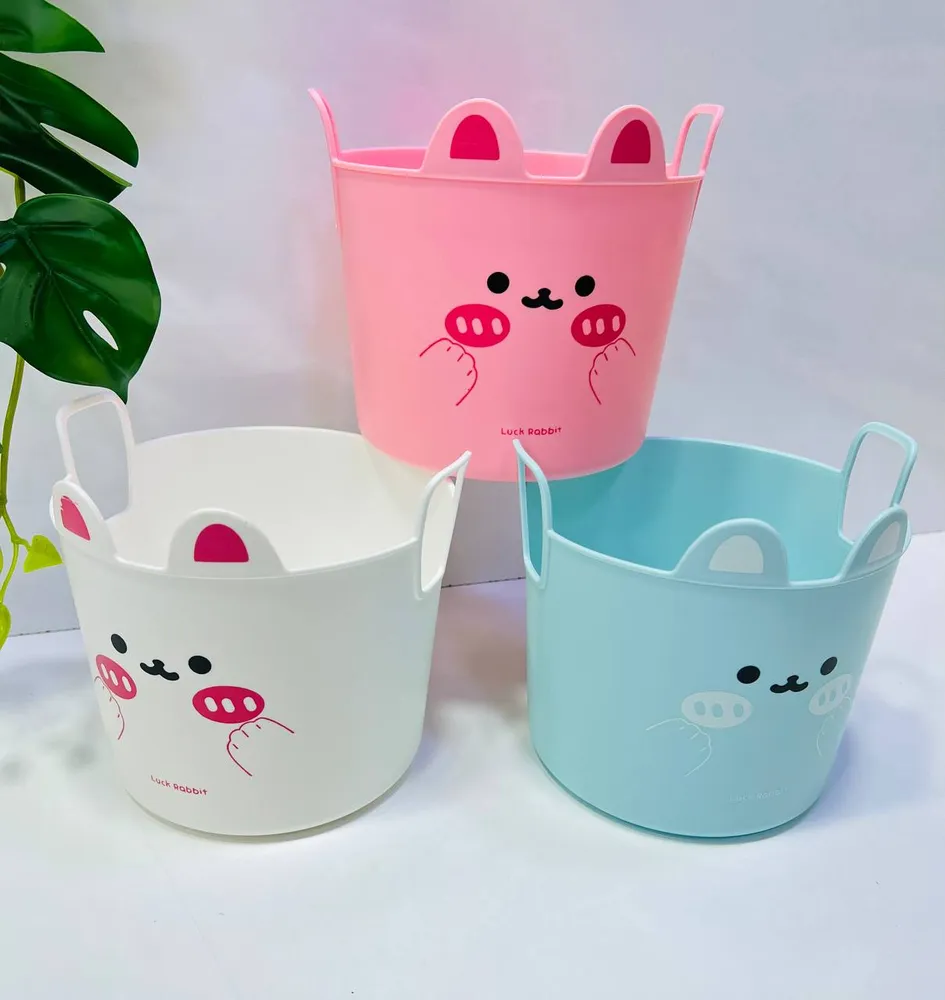Ce panier de rangement polyvalent est à la fois mignon et très pratique. Fabriqué en plastique souple (type EVA ou similaire), il est léger, facile à nettoyer et durable. Son design est centré sur un visage de lapin "Luck Rabbit" de style Kawaii, avec des oreilles 3D intégrées au bord et des poignées stylisées. Disponible dans des couleurs pastel vives (rose, blanc ou bleu ciel), il ajoute une touche ludique à n'importe quelle pièce. Sa construction sans arêtes vives le rend particulièrement sûr pour les chambres d'enfants.