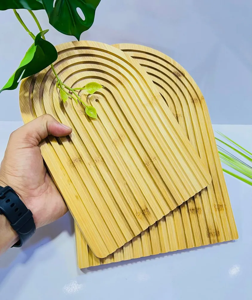 0.0 | Planches de Service Décoratives en Bambou Forme Arche avec Rainures Arc-en-ciel | 30.00 | Cet ensemble décoratif et polyvalent comprend deux planches de service de tailles légèrement différentes, toutes deux fabriquées en bambou laminé clair. Elles se distinguent par leur forme d'arche unique et un motif gravé de rainures semi-circulaires (évoquant un arc-en-ciel ou des ondes) qui ajoute une texture tactile et visuelle. Le bambou est un matériau écologique, léger et naturellement antibactérien. Les planches sont conçues pour être non seulement fonctionnelles mais aussi pour servir de pièces décoratives attrayantes dans la cuisine ou la salle à manger. |