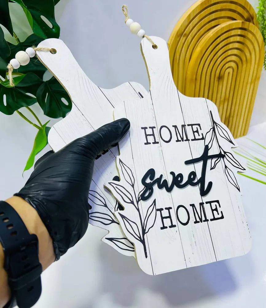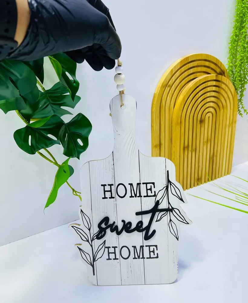 0.0 | Plaque Décorative "Home Sweet Home" Style Planche à Découper Rustique | 35.00 | Cette plaque décorative murale apporte une touche de charme rustique et chaleureux à n'importe quel espace. Conçue dans la forme d'une planche à découper traditionnelle, elle présente une finition en bois blanc vieilli avec un motif à lattes. Le message réconfortant "Home Sweet Home" est inscrit en relief noir, avec une typographie mélangeant lettres capitales pour HOME et un style manuscrit pour sweet, encadré de motifs de feuillage simples. Elle est suspendue par une ficelle rustique ornée de perles en bois claires pour parfaire son allure de ferme chic.