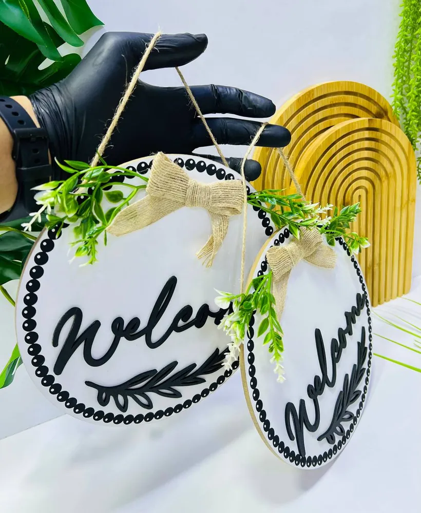 0.0 | Plaque de Bienvenue Ovale Welcome Style Fermier Chic | 35.00 | Cette élégante plaque de bienvenue ovale est l'accessoire parfait pour accueillir vos invités avec chaleur et style. Elle présente une base blanche nette sur laquelle le mot "Welcome" est inscrit en relief noir avec une police manuscrite, accentué par une couronne de perles noires sur le pourtour. L'ensemble est rehaussé d'une touche rustique grâce au nœud décoratif en toile de jute et d'une touche de fraîcheur avec le feuillage et les petites fleurs artificielles. Elle est prête à être accrochée grâce à sa ficelle de chanvre naturelle.