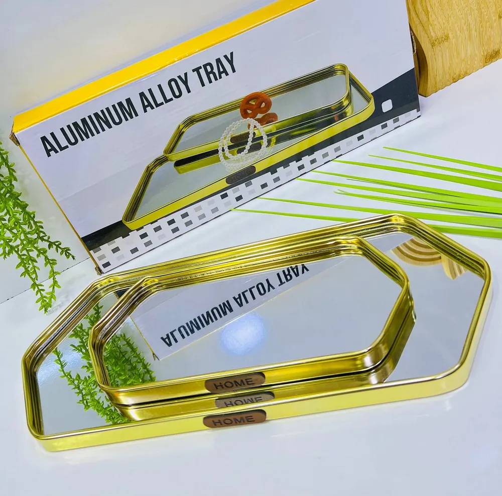 Ce magnifique plateau décoratif est l'accessoire idéal pour ajouter une touche d'élégance moderne à votre intérieur. Fabriqué en alliage d'aluminium durable avec une finition dorée brillante, il est doté d'une base miroitée qui reflète magnifiquement la lumière et les objets qu'il contient. Il est souvent vendu en ensemble de deux tailles différentes (comme on le voit sur la photo) pour offrir une polyvalence de style et d'usage. Sa forme rectangulaire aux coins biseautés/hexagonaux lui confère un design unique et sophistiqué.