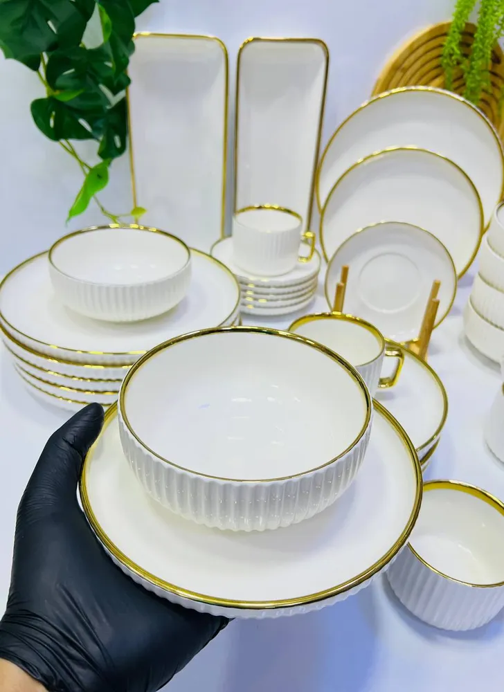 Ce magnifique service de table 32 pièces est l'incarnation du luxe et du raffinement. Conçu pour six à huit convives (selon la composition exacte du set), il transforme chaque repas en une occasion spéciale. Chaque pièce est fabriquée en porcelaine ou céramique fine de haute qualité, arborant un éclatant blanc pur. L'élégance est accentuée par un liseré doré raffiné qui borde chaque pièce, ainsi que par les poignées dorées des tasses et de certains bols. La caractéristique distinctive de ce service réside dans le motif côtelé vertical délicat qui orne les tasses et les bols, ajoutant une texture subtile et moderne au design classique. Le set comprend généralement une variété d'assiettes, de bols, de tasses avec soucoupes et de plats de service rectangulaires, offrant tout le nécessaire pour une présentation de table complète et harmonieuse.