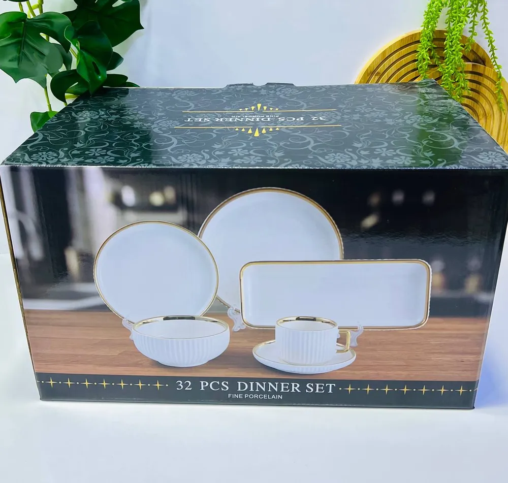 0.0 | Service de Table Luxe 32 Pièces Blanc et Or Motif Côtelé | 600.00 | Ce magnifique service de table 32 pièces est l'incarnation du luxe et du raffinement. Conçu pour six à huit convives (selon la composition exacte du set), il transforme chaque repas en une occasion spéciale. Chaque pièce est fabriquée en porcelaine ou céramique fine de haute qualité, arborant un éclatant blanc pur. L'élégance est accentuée par un liseré doré raffiné qui borde chaque pièce, ainsi que par les poignées dorées des tasses et de certains bols. La caractéristique distinctive de ce service réside dans le motif côtelé vertical délicat qui orne les tasses et les bols, ajoutant une texture subtile et moderne au design classique. Le set comprend généralement une variété d'assiettes, de bols, de tasses avec soucoupes et de plats de service rectangulaires, offrant tout le nécessaire pour une présentation de table complète et harmonieuse.