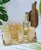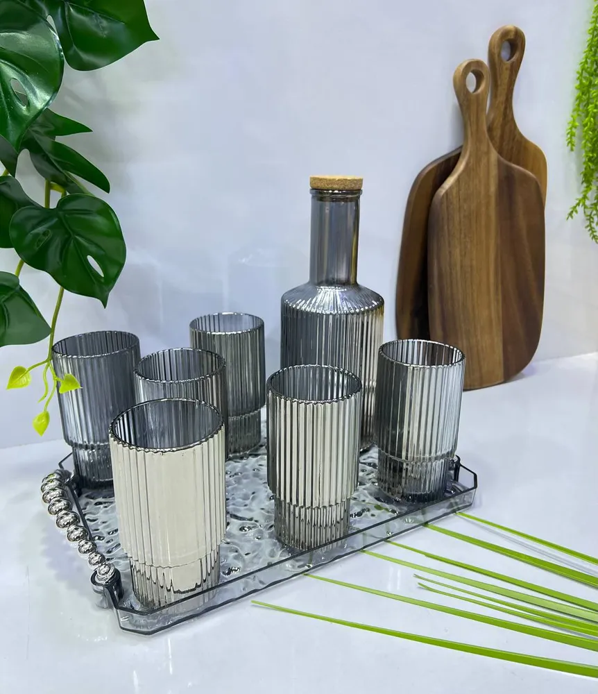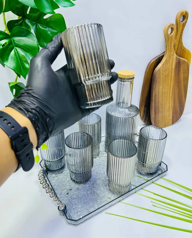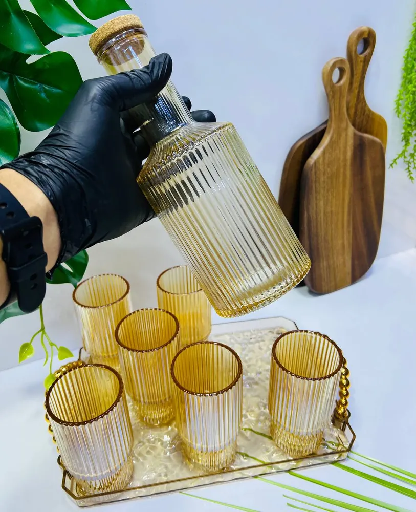 Ce magnifique set de verrerie de couleur ambrée (dorée) apporte une touche de luxe et de sophistication à votre service de table ou à votre coin bar. Il comprend six verres hauts et une bouteille/carafe assortie, le tout sur un plateau décoratif. La bouteille est dotée d'un bouchon en liège pour une conservation optimale. L'ensemble se distingue par son design cannelé vertical (ou à rayures) qui réfléchit la lumière de manière élégante, soulignant la teinte riche du verre. Il est parfait pour servir des boissons froides, du thé glacé, des jus de fruits ou des spiritueux, que ce soit pour un usage quotidien ou pour des occasions spéciales.