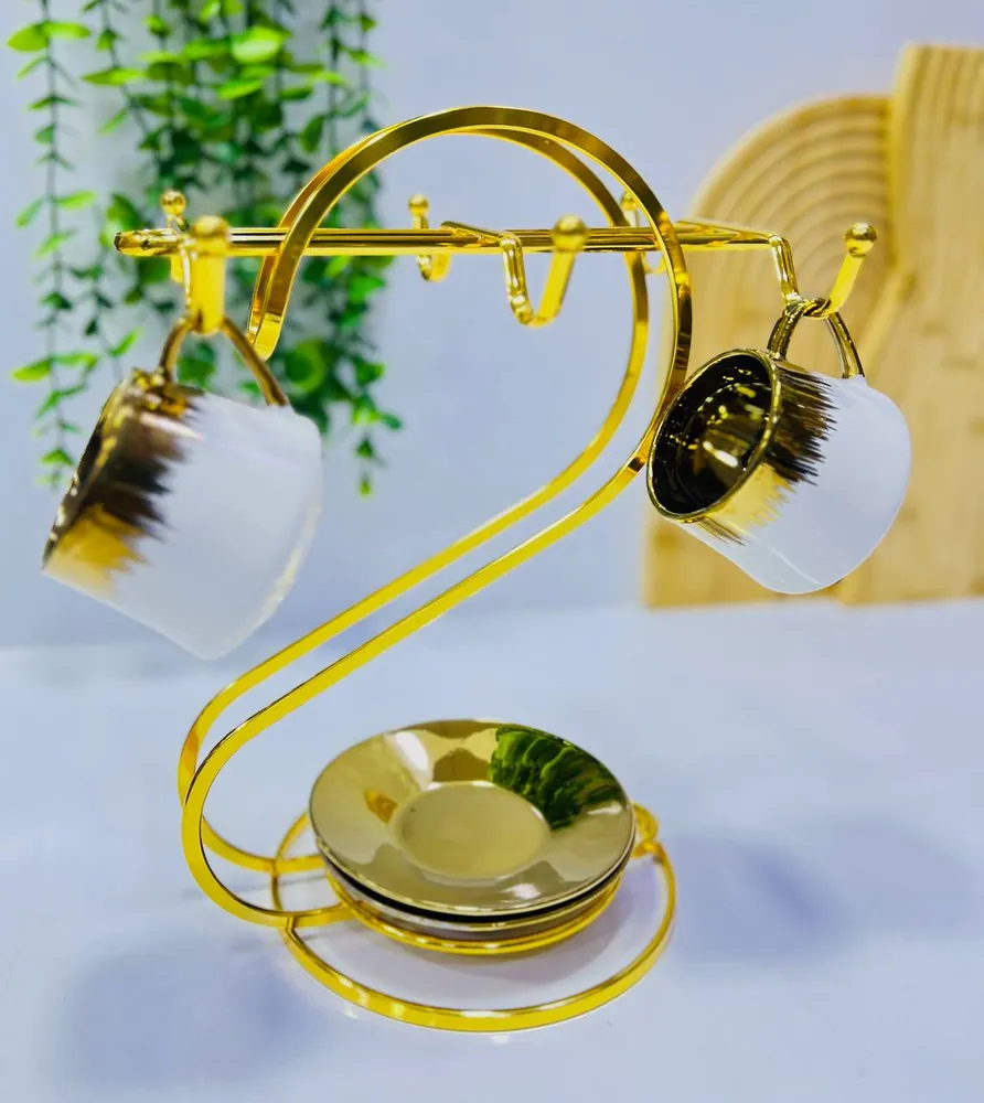 Ce support à tasses décoratif, baptisé "Spirale Dorée", est un ajout élégant et pratique à toute cuisine ou coin café. Il est conçu non seulement pour organiser vos tasses, mais aussi pour servir de pièce maîtresse décorative grâce à son fini métallique doré éclatant.