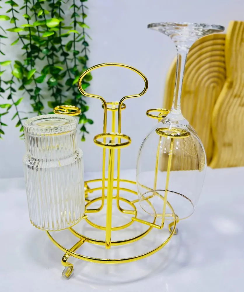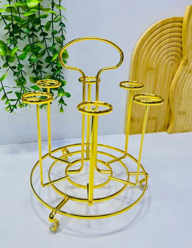 Fabriqué en métal, il présente une finition dorée brillante sur toute sa structure. Le support est conçu pour accueillir six verres (typiquement des tasses, des verres à eau ou des verres à liqueur) sur ses anneaux métalliques. Sa base stable et son anneau de transport supérieur facilitent le déplacement. Un détail soigné : les petits pieds en plastique transparent qui soulèvent légèrement la base.