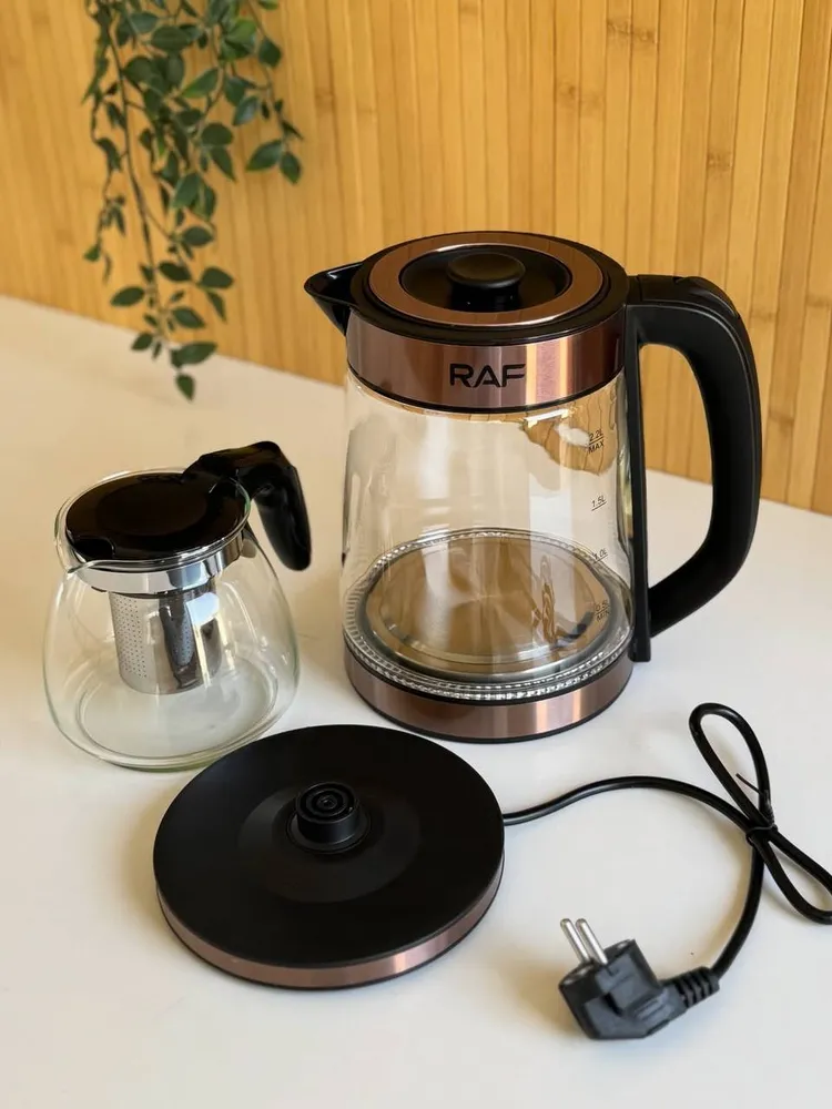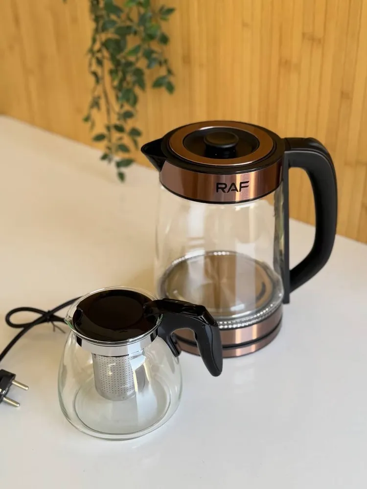 Cet appareil est une bouilloire électrique de type samovar moderne (également appelée "çaydanlık" turc) de la marque RAF. Il est conçu pour les amateurs de thé qui apprécient une méthode d'infusion traditionnelle avec la commodité de l'électrique. L'appareil se compose d'une grande bouilloire inférieure en verre transparent et d'une théière supérieure en verre plus petite avec un infuseur/filtre intégré. Le design est rehaussé par un élégant revêtement métallique de couleur cuivrée (ou bronze/rose gold) sur la base et le col, offrant un contraste chic avec le verre et les poignées noires. Il permet de faire bouillir l'eau rapidement dans la partie inférieure tout en infusant le thé (concentré) doucement au-dessus grâce à la vapeur, pour un thé chaud et savoureux à tout moment.
